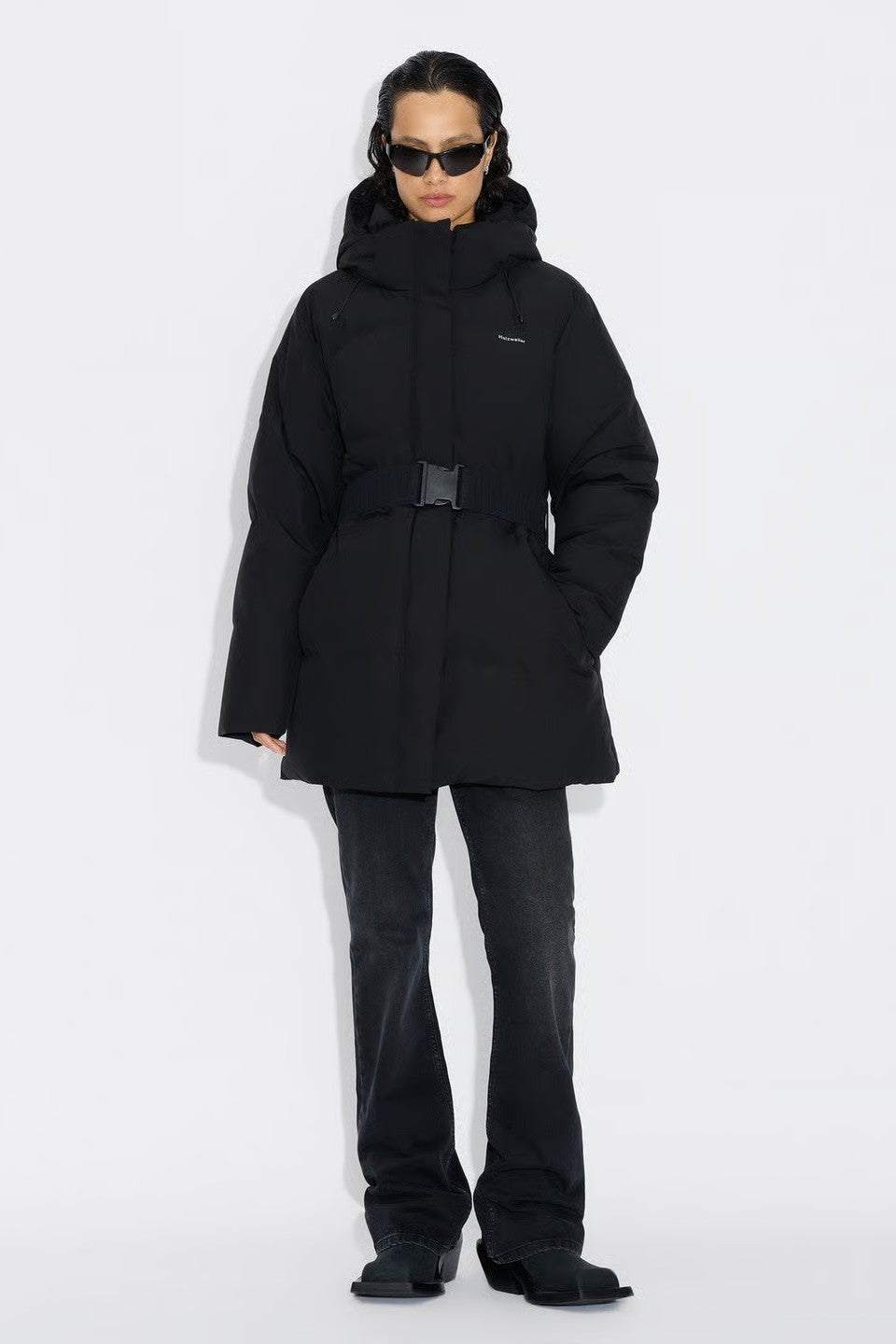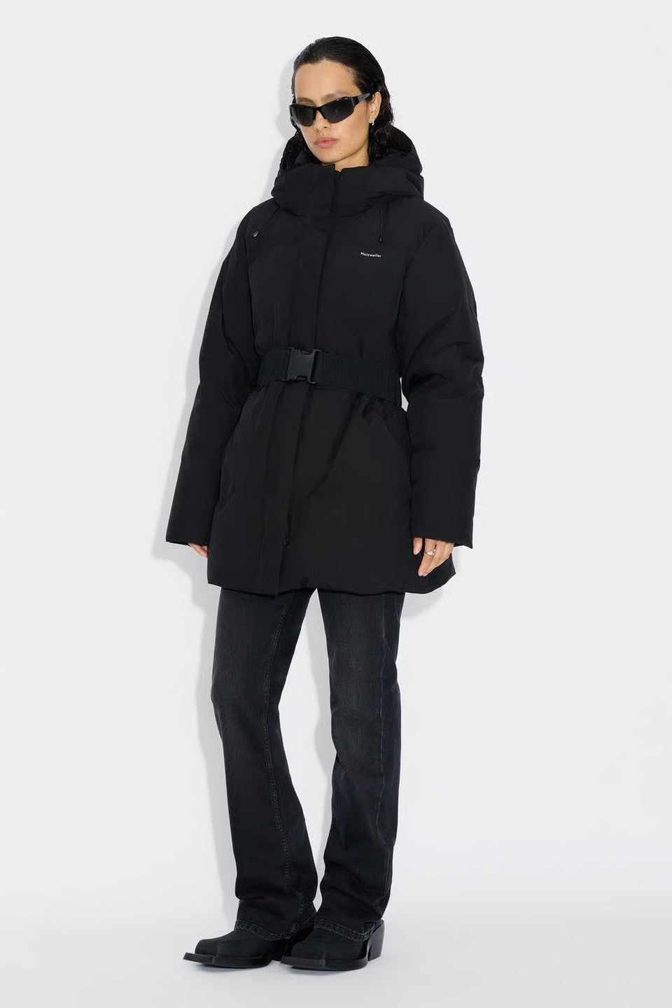 Halvlång dunjacka med avtagbar huva och skärp. Tvåvägs blixtlås och "knappar" i  kardborrband.